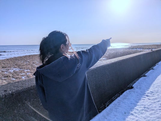 「あっちの方まで昆布を拾いながらずーっと歩きますよ」と教えてくれる奈々さん。