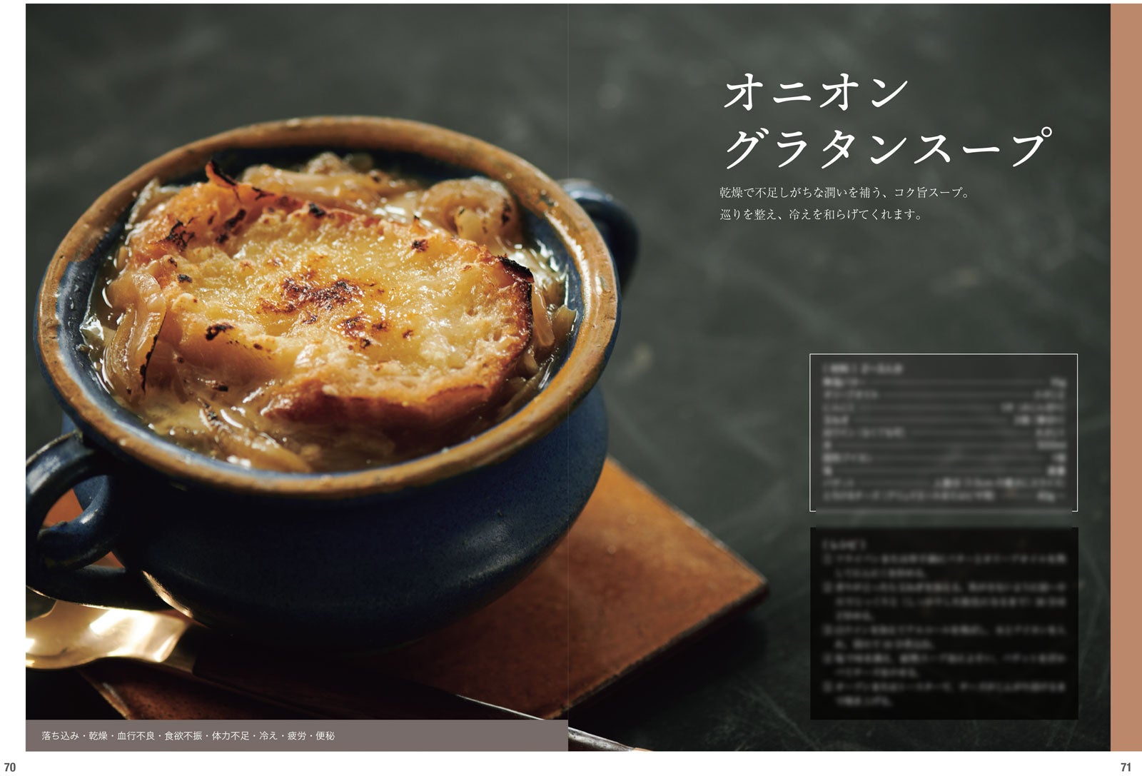 春夏秋冬、旬の食材を活用して体調に合ったレシピを楽しむことができます。それぞれのレシピページには、ストレスや肩こり、むくみなどの症状が書かれており、取り入れたいレシピがすぐにわかります。巻末には便利な「症状別索引」も。