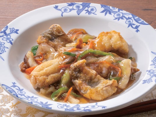 かりかりふっくらに揚げたスケトウダラに、3種類の酢を配合した甘酢あんをかけてさっぱり仕上げました。こだわりの酢で仕上げることで、酸味の後に甘味が残るたまらない逸品です。
