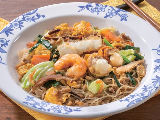 ラードで炒めた豚肉、干しエビ、貝柱、イカ、さらにフライドエシャロットの独特な香りが引き立つビーフンです。隠し味として調理の最後に黒酢を入れることで、風味豊かに仕上げています。