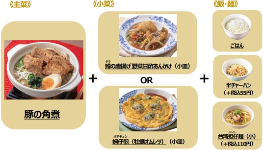 主菜に「豚の角煮」、小菜に「鱈の唐揚げ 野菜甘酢あんかけ」または「蚵仔煎(オアチェン)(牡蠣オムレツ)」、さらにお好きなご飯または麺まで選べる特別なセットです。