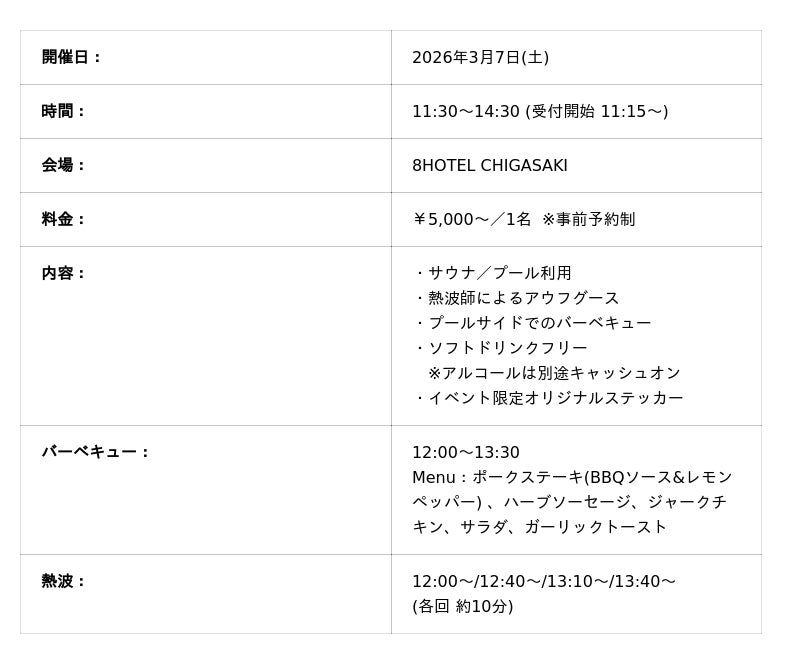 ※多くのお客様にご参加いただけるよう、熱波はお一人様1枠までとさせていただきます。空きがある場合は追加参加のご案内をいたします。