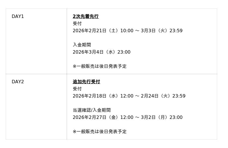 なおDAY1のチケットは、本日までがチケット最速先行受付期間となり、2月21日(土)より2次先着先行受付を開始します。