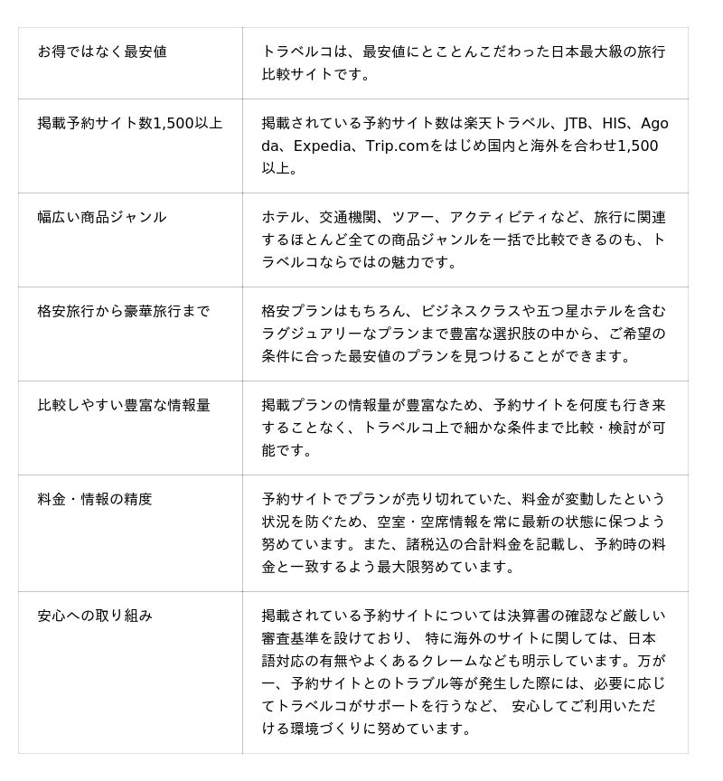 トラベルコは、これまでもこれからも「最も安く・最も便利で・最も親切に」をモットーに、皆さまの快適な旅を全力でサポートしてまいります。