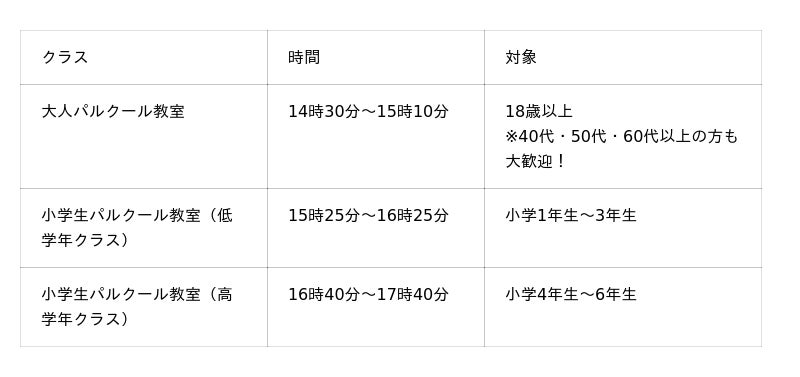 大人パルクール教室 :https://parkour-tokyo.com/taiken/