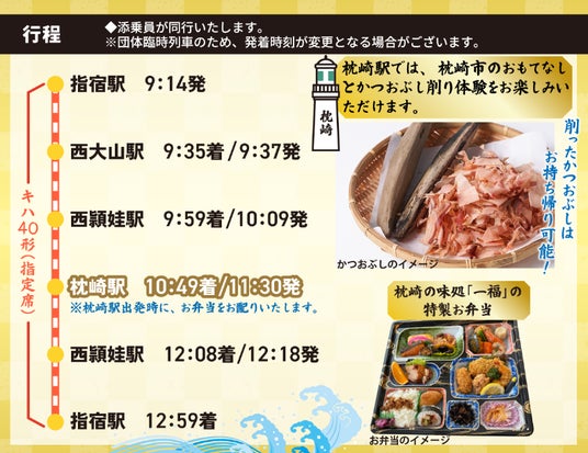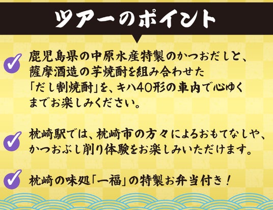 JR九州は、中原水産、薩摩酒造、枕崎市と連携し、指宿駅~枕崎駅間を特別運行するオリジナルツアー 南薩の絶景を愉しむ「だし割焼酎列車」を発売中です。車内では、職人だしと本格焼酎を合わせた特製だし割焼酎や「一福」のお弁当、枕崎駅でのかつおぶし削り体験をはじめとするおもてなしをお楽しみいただけます。「だし割焼酎列車」で南薩を愉しむ旅に出かけてみませんか?皆さまのご参加をお待ちしております。