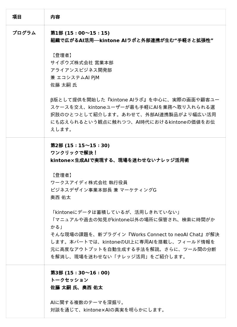 AX推進支援を行うワークスアイディ株式会社(本社:東京都渋谷区、代表取締役社長:池邉竜一、以下「ワークスアイディ」)は、kintoneと生成AIをシームレスに連携させ、ナレッジ活用を自動化する新プラグイン「Works Connect to neoAI Chat」をリリースいたしました。これを記念し、2026年3月12日(木)にサイボウズ株式会社(本社:東京都中央区、代表取締役社長:青野慶久、以下「サイボウズ」)の佐藤太嗣氏をゲストにお迎えし、無料ウェビナー「kintone×AIで実務の幅を広げる活用術」を開催します。