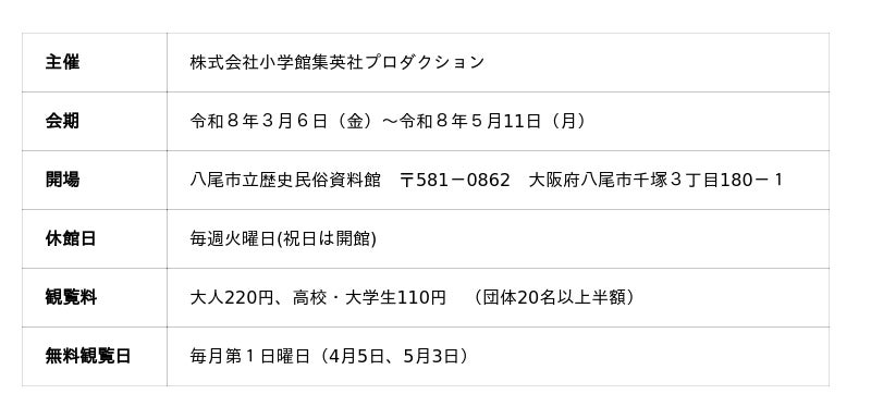 観覧料の免除 中学生以下、身体障害者手帳、療育手帳または精神障害者保健福祉手帳の所持者及びその介助者並びに学校園行事の引率者(八尾市立歴史民俗資料館設置条例第10条の2第3項及び別表により設定。)