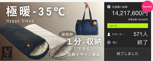 クラウドファンディング開始4日目で1,000万円(達成率10,000%)超え。冬キャンプから来客・正月帰省時の布団にまで使える、極暖-35℃ 北欧デザインの寝袋「ヒュッゲスリープ Deluxe」!