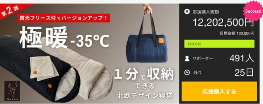 キャンプ用品メーカー株式会社ヌーカ(神奈川県藤沢市 代表取締役社長:小堺 弓木奈)が、2023年11月22日より応援購入サービスMakuakeにて販売を開始した、極暖-35℃ 北欧デザインの寝袋「Hygge Sleep Deluxe(ヒュッゲスリープ デラックス)」は、販売開始から4日間で目標額の100倍の1,000万円(達成率10000%)を超え、1週間で1,220万円を達成いたしました。