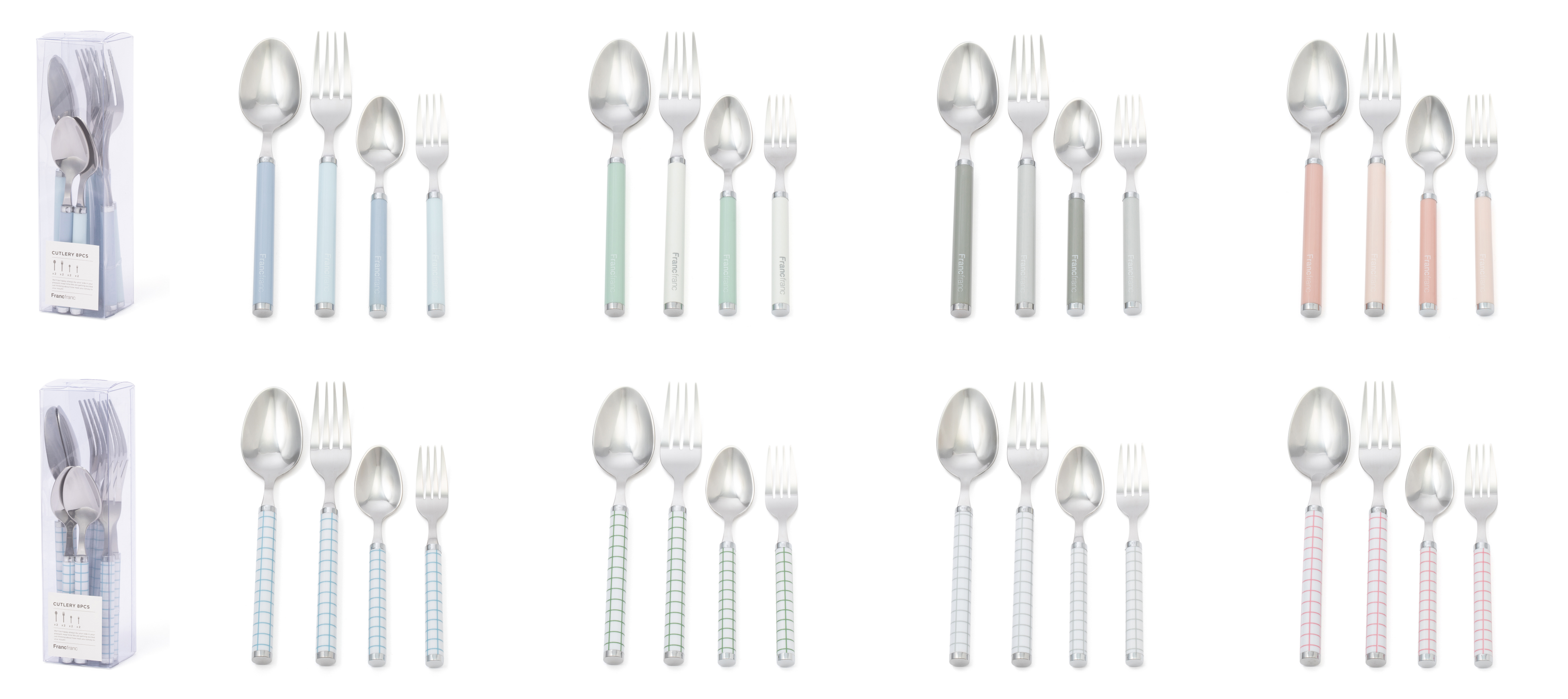 毎日の食卓に便利なカトラリー8点セットです。ディナースプーン、フォーク、ティースプーン、ケーキフォークが2本ずつ入っており、新生活にあると便利な基本のカトラリーが一式揃います。シンプルなロゴやチェック柄など、長くご愛用いただけるようシンプルながらも食卓に取り入れやすいデザインに仕上げました。食器セットと色を合わせているので、統一感のあるコーディネートが楽しめます。