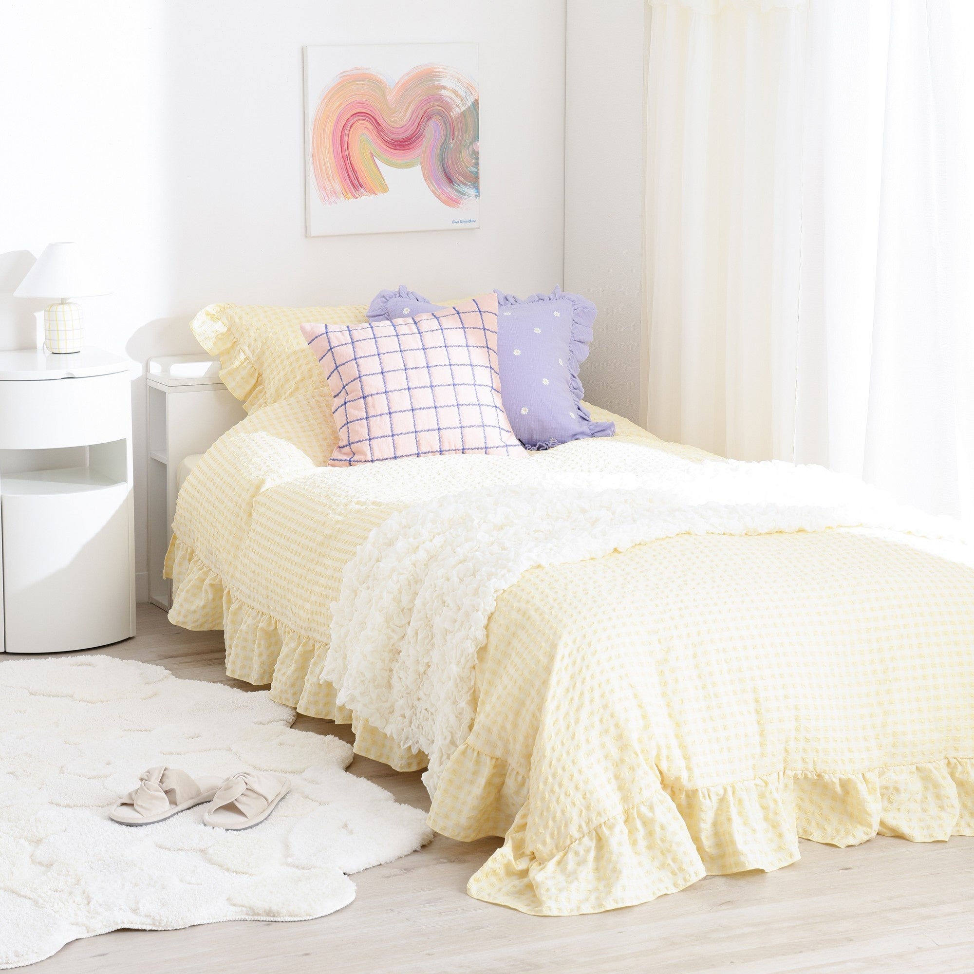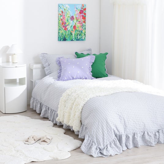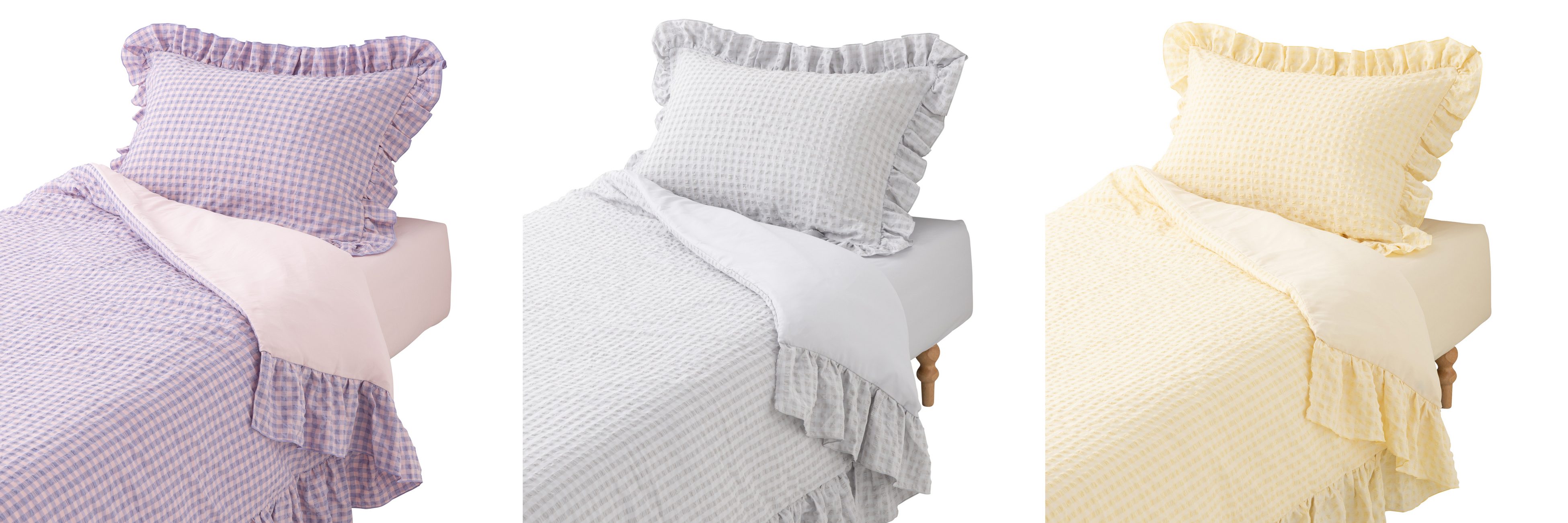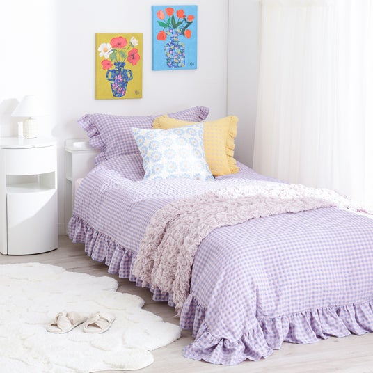 新生活に必要な、まくらカバー、掛け布団カバー、ボックスシーツがすべて入った寝具カバーセットです。ギンガムチェック柄とフリルで華やかに仕上げたトレンド感のあるデザインで、色合わせに悩まず、統一感のあるコーディネートを楽しめます。