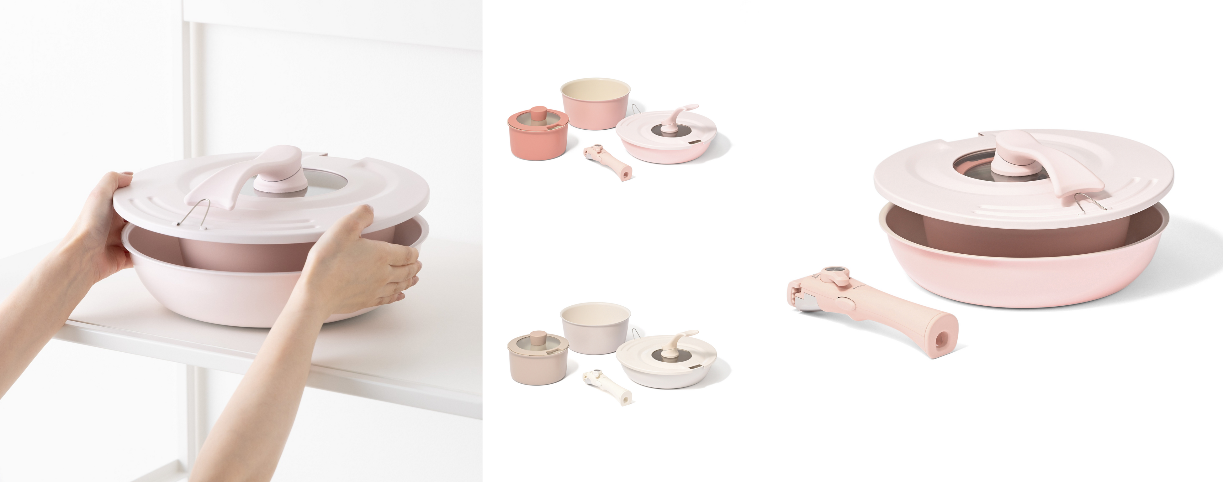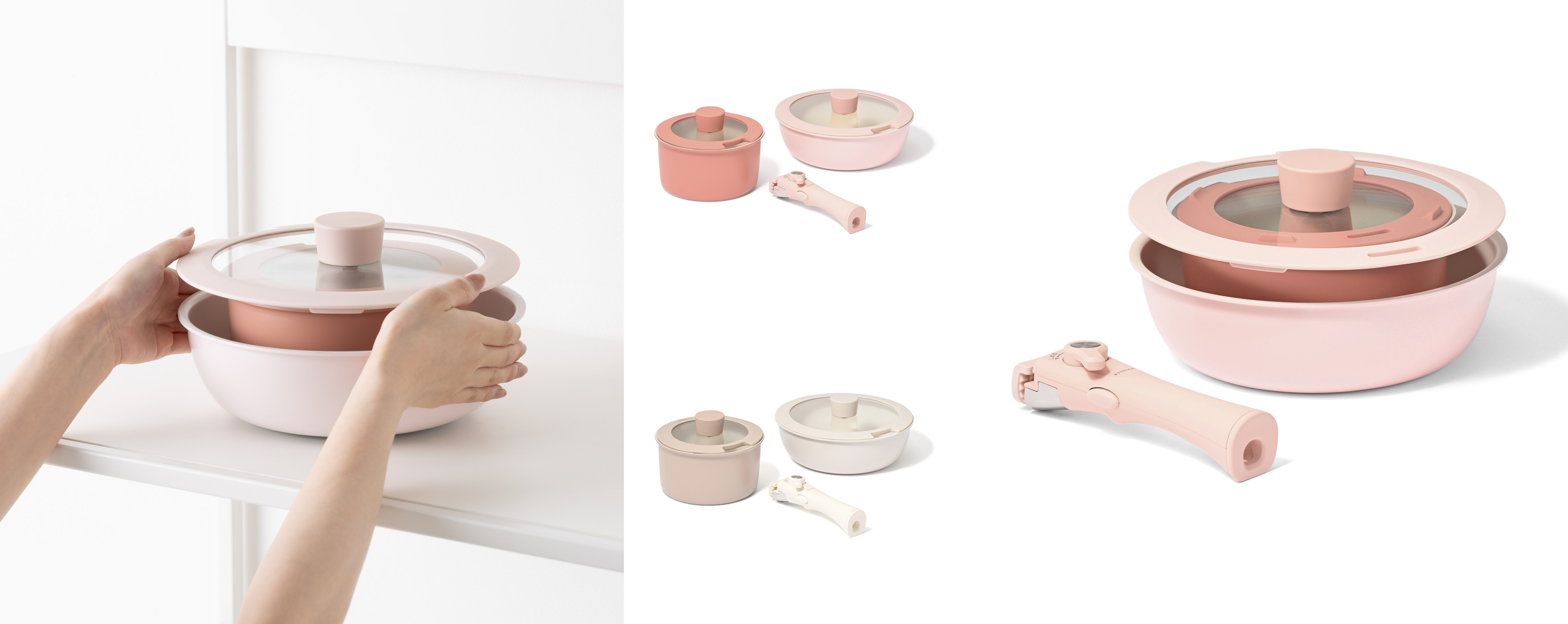 取っ手が着脱でき、限られたスペースでも重ねて収納できる鍋・フライパンセットです。可愛らしいグラデーションカラーが、毎日の料理時間を楽しく演出。コンロに並べても、重ねて収納しても、上品な色の繋がりがキッチンを華やかに彩ります。