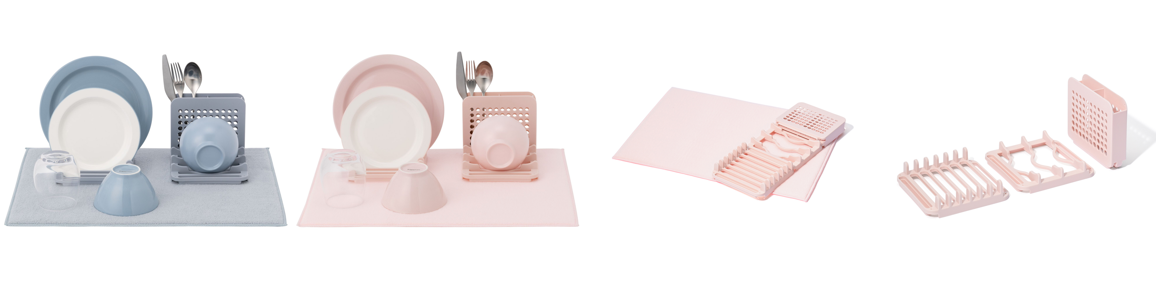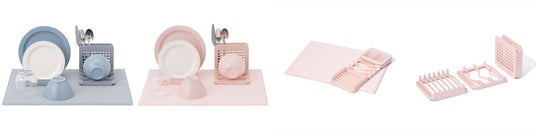 ディッシュラックは幅広いサイズの食器を立てられる仕様へ見直し、3つに分解できる設計でコンパクトなキッチンにも置きやすく。