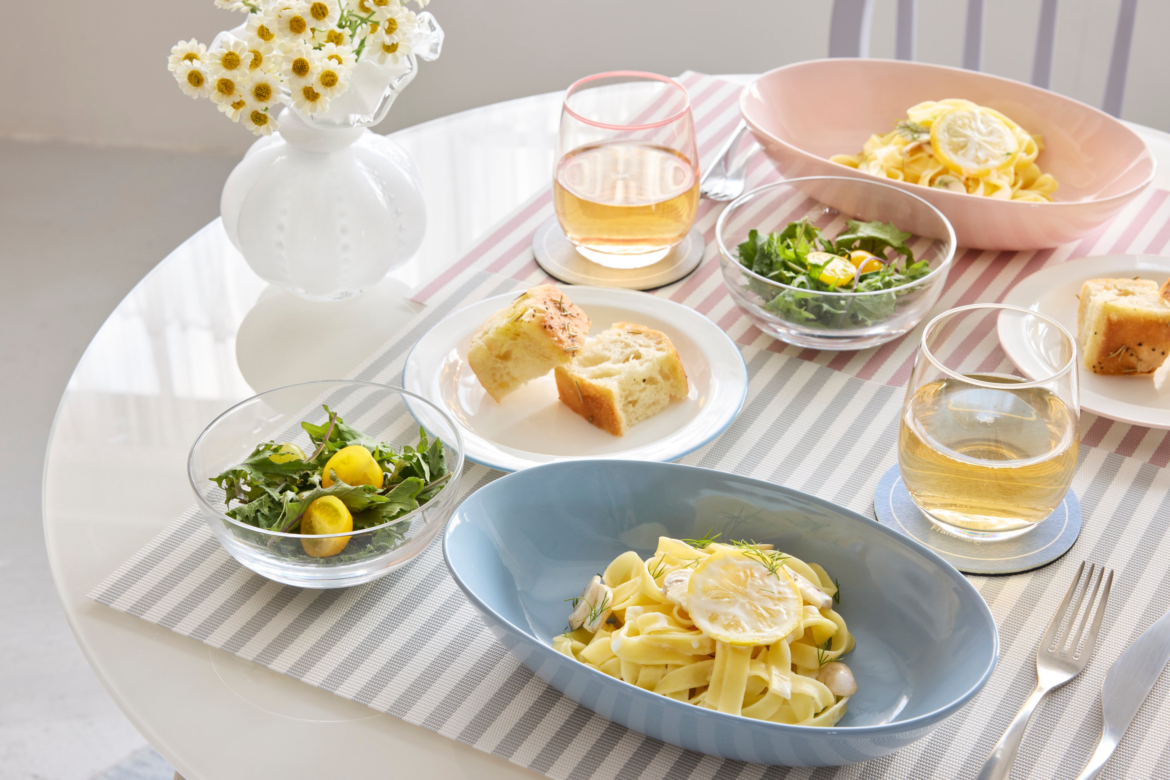 「モーニング」や「ランチタイム」には、トレンド感のあるガラスカップをプラスして、食卓にさりげない抜け感を。