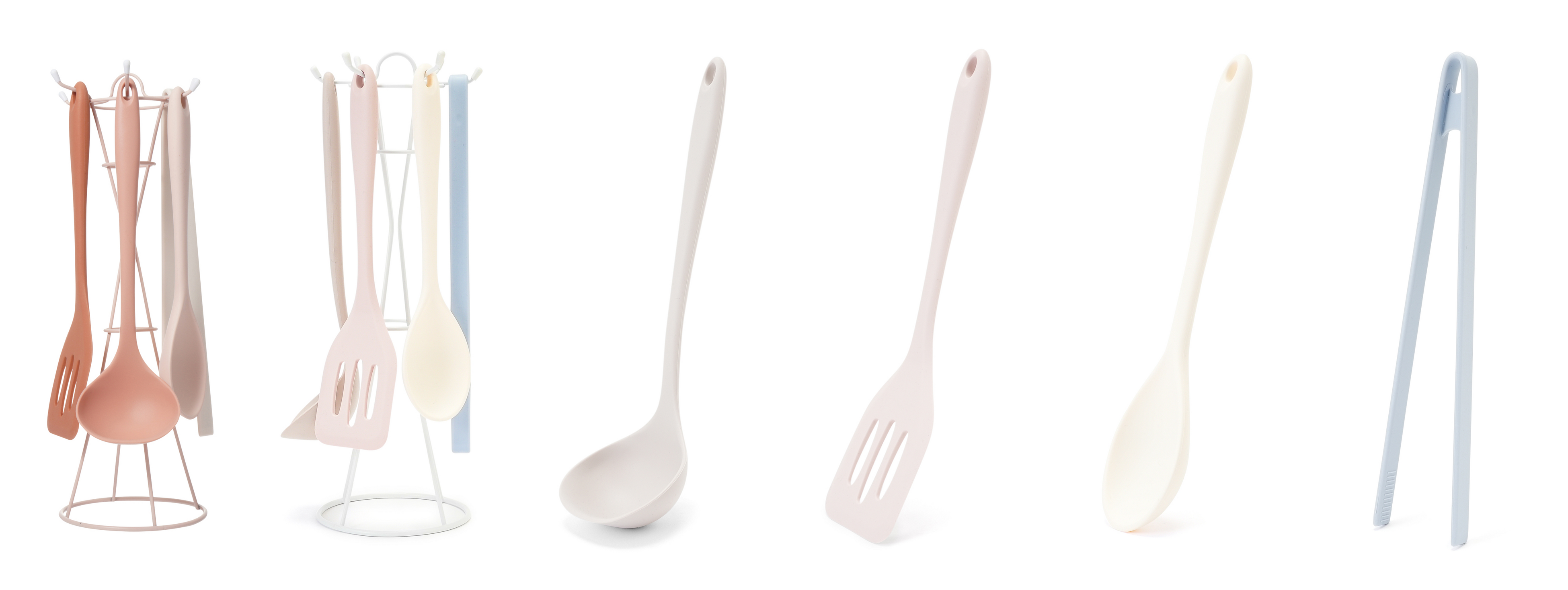 レードル、スプーン、フライ返し、トングと、それらを掛けて収納できるホルダー付きで、新生活のスタートに必要なアイテムをひとまとめに。シリコン素材を使用しているため、鍋やフライパンを傷つけにくく、熱が伝わりにくい仕様。先端が焦げにくく、長くお使いいただけます。コンパクトな一人暮らしのキッチンでもスペースを取らず、見せる収納として楽しめるのも魅力です。