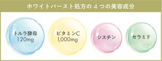 そこで、現代の美容トレンドである「白玉*1美容」を目指すユーザーが納得できる成分マネジメントとして、1.高濃度のビタミンCに加えて、2.トルラ酵母、3.シスチン、4.セラミドの4つの美容成分を贅沢に配合し、多才な成分をまとめて届ける「飲む白玉*1美容」の実現を目指しました。