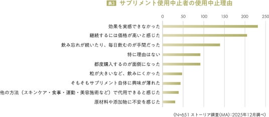 しかしながら、サプリメント使用者には使用を中止してしまうユーザーも多く存在していることも事実であり、「効果実感」「コスパ感」「使用上の手間」など継続へのハードルを感じているユーザーも少なくありません(表3)。