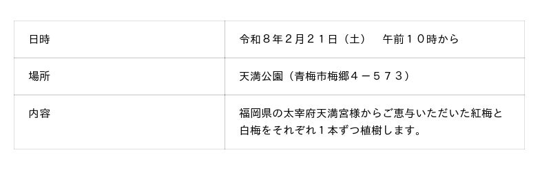 青梅市では、平成21(2009)年に青梅の梅樹からウメ輪紋ウイルス(PPV)が日本で初めて確認され、市内全域で約4万本の梅樹を伐採いたしました。その後、再植樹が認められ、平成28(2016)年に梅樹の再植樹を始め、今年(2026年)は10年目の節目に当たります。