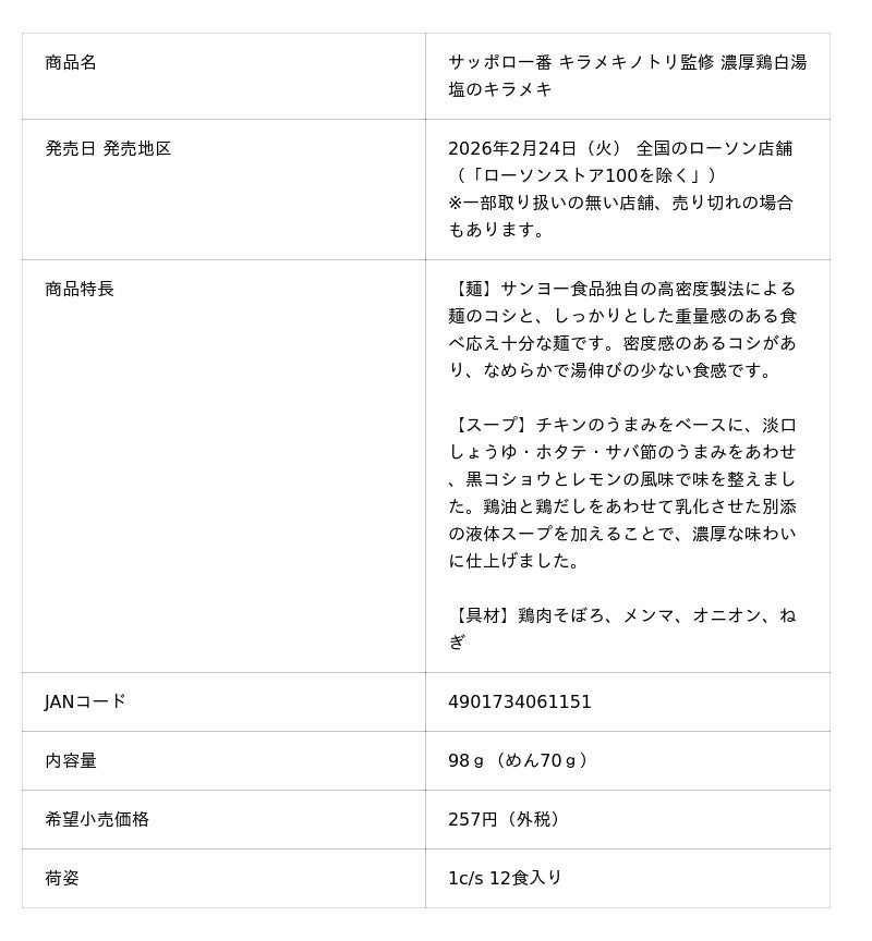 【京都発「キラメキノトリ」、初のコンビニ展開へ】ローソン店舗で、カップ麺「サッポロ一番 キラメキノトリ監修 濃厚鶏白湯 塩のキラメキ」など3商品を2月24日から発売開始
