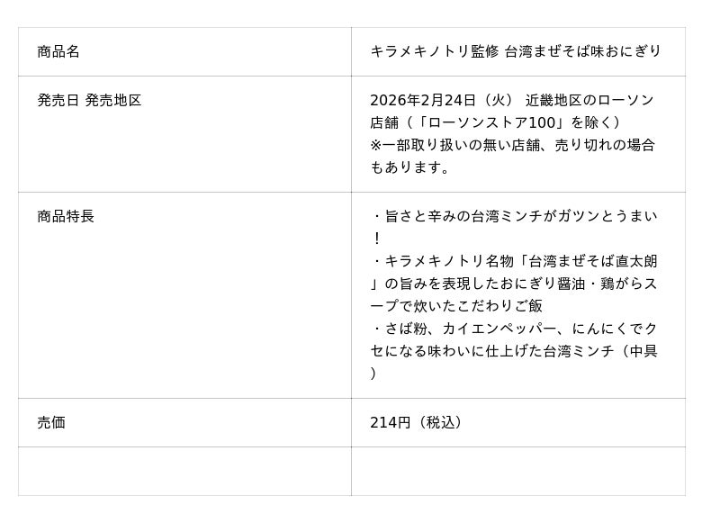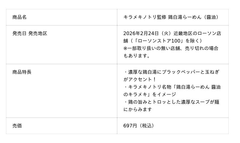 株式会社吉野家ホールディングス(本社:東京都中央区、代表取締役社長:成瀬哲也)のグループ会社であり、「鶏白湯らーめん」と「台湾まぜそば」を看板商品とするラーメン店「キラメキノトリ」を展開するキラメキノ未来株式会社(本社:京都府京都市、代表取締役社長:久保田雅彦)は、初のコンビニエンスストア展開商品として監修したカップ麺・ホット麺・おにぎりの計3商品を、2月24日(火)からローソン店舗で発売します。