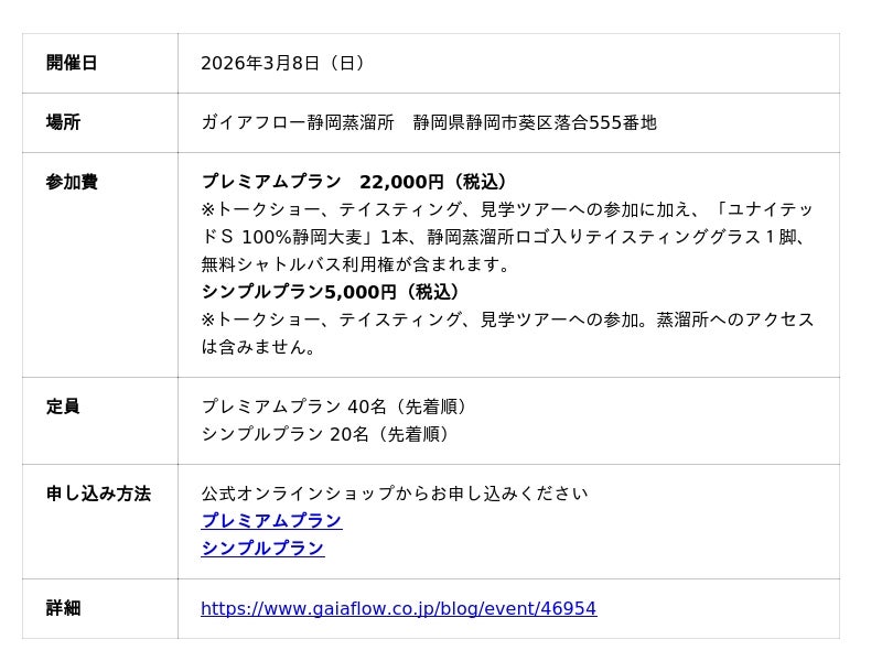 ・静岡蒸溜所でのイベント(トークショー、テイスティング、見学ツアー)にご参加いただくコースです。