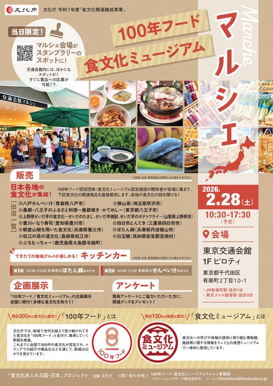 文化庁は、2月27日(金)に「100年フード・食文化ミュージアム サミット」、2月28日(土)に「100年フード・食文化ミュージアムマルシェ」を、東京交通会館(東京都千代田区)にて続けて開催します。