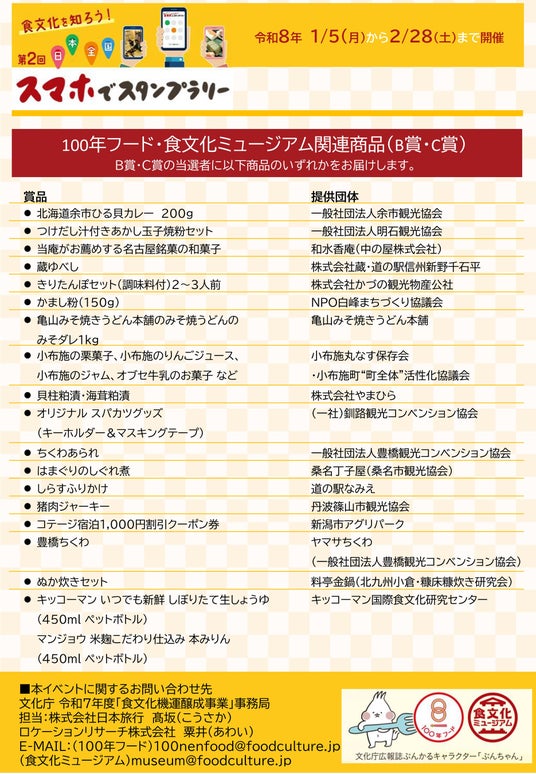 - 食文化を知ろう!日本全国スマホでスタンプラリーhttps://www.bunka.go.jp/seisaku/shokubunka/foodculture/hyakunenfood/stamprally/