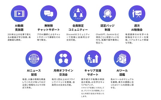 サービス名: デジライズ AIスクール提供内容: 動画コンテンツ(200本以上)、チャットサポート、コミュニティ参加、週次勉強会、ニュース配信、認定バッジ、キャリア支援、AIツール図鑑 等