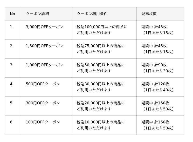 以下、開催期間中のクーポン詳細や利用条件・配布枚数になります。