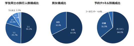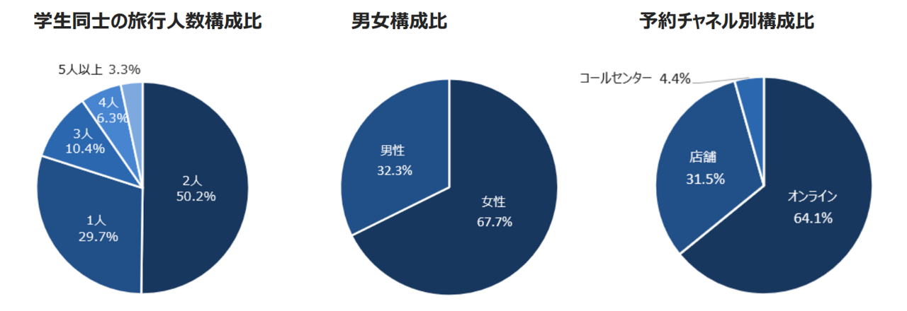 予約チャネルとしては、「オンライン」が64.1%と最も高く、「店舗」が31.5%、「コールセンター」が4.4%となりました。デジタルネイティブであることから、24時間いつでも予約から支払いまでネットで完結することの利便性が好まれていると考えます。一方で、店舗で予約される学生の旅行先を地域別構成比でみると、「アジア地域」が50.3%と全体の構成比からは14.0ポイント減少し、「ヨーロッパ地域」が22.9%と7.1ポイント増加しています。高額で複数都市の周遊など複雑な地域への旅行は、対面を希望される方が増え、難易度によりオンラインと店舗を使い分けしている傾向が窺えます。