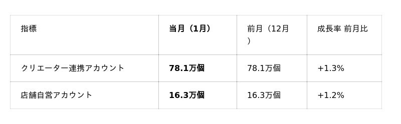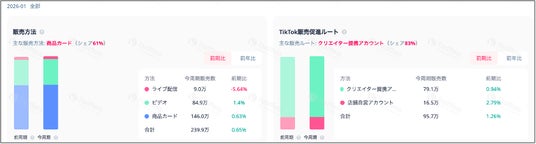ライブ配信・カゴ付きショート動画・商品カードの販売推移を見ると、1月はライブ経由が前月比▲5.3%と減少した一方、ビデオ経由は+1.4%、商品カード経由は+0.7%と堅調に推移しました。特にライブ販売の減少は、年末セール反動や実施本数減少の影響が考えられます。一方で、ショート動画および商品カード経由の販売が底堅く、流入構造がより安定型へシフトしている状況が確認されます。また、アカウント別では、クリエイター連携アカウント(+1.3%)および店舗自営アカウント(+1.2%)ともに微増となり、販売チャネルの分散と自社運用強化が継続しています。