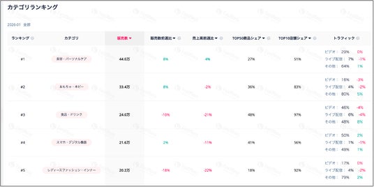 「スマホ・デジタル機器」は+1.9%と横ばい圏で推移しており、全体としては、嗜好性よりも実用性・日常消費型カテゴリーが選好される構造が鮮明となっています。また、上位カテゴリーでは引き続き動画経由の流入比率が高く、ショート動画主導型の販売構造が定着しつつある状況が確認されます。
