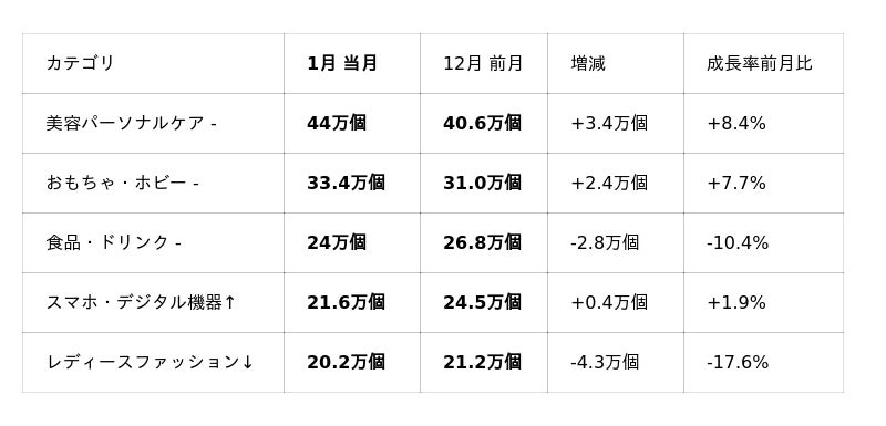 特に、ストレス解消グッズやインソール、スマホ関連アクセサリーなど、**即決性の高い価格帯(~2,000円前後)**の商品が堅調です。一方で、12月のセール反動を受け、伸び率にはばらつきが見られ、前年末特需型カテゴリーは調整局面に入った傾向がうかがえます。
