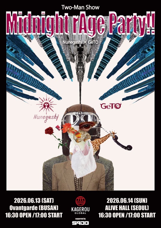 音楽イベント「MIDNIGHT rAGE PARTY!!」が、2026年6月13日(土)韓国・釜山、翌14日(日)ソウルの2都市にて開催決定。出演には、日本からGeTO、韓国からNunegashiがラインナップ。SNSからバイラルに広がり、国境を越えて支持を集める両アーティストが、アジアの夜に新たな熱狂を生み出します。
