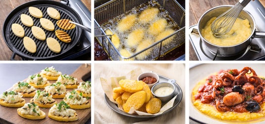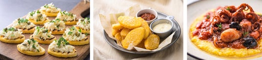 本来、弱火で約40分も練り続ける必要があるポレンタの調理工程を工場で完結し、厨房のオペレーションを大幅に簡略化することが可能となりました。現場ではフライパンやグリルで焼いて前菜やビュッフェメニューに使用したり、フライヤーで揚げてフィンガーフードにしたり、凍ったまま水を加えて5-6分加熱して伝統的な付け合わせにも使えるなど、本品だけで多彩なメニュー展開ができます。