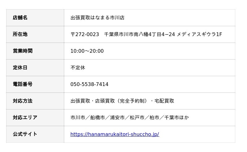 出張買取はなまる市川店(所在地:千葉県市川市南八幡4丁目4-24 メディアスギウラ1F)は、