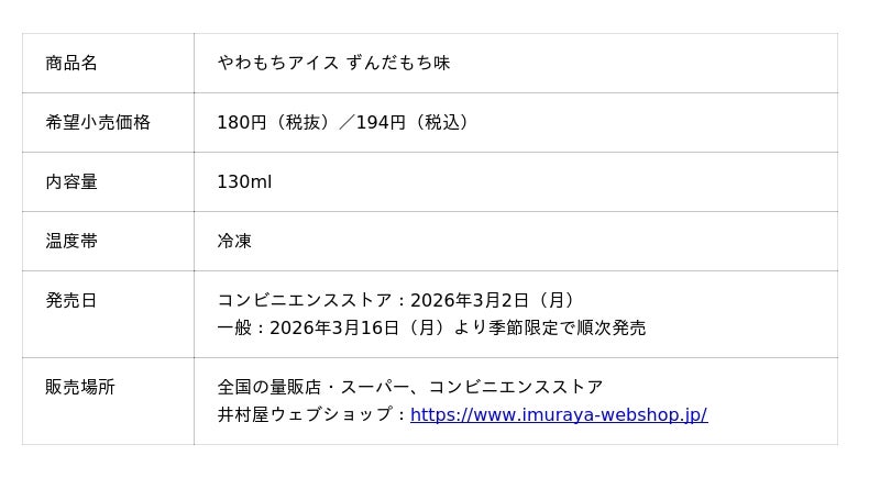井村屋株式会社(本社:三重県津市高茶屋七丁目1番1号、社長:岩本 康)は、アイスの人気ブランドである「やわもちアイスシリーズ」より、新商品『やわもちアイス ずんだもち味』を、コンビニエンスストア:3月2日(月)、一般:3月16日(月)より季節限定で順次発売します。