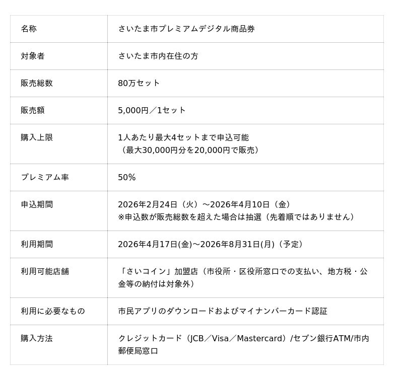 - さいたま市/ プレミアム率50%!「さいたま市プレミアムデジタル商品券」の申込を開始します~2月24日から4月10日まで~https://www.city.saitama.lg.jp/006/014/008/003/014/010/p127338.html