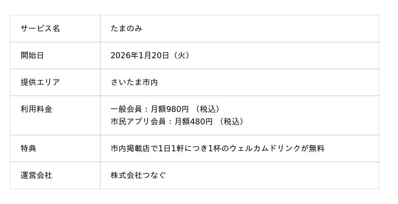 「たまのみ」は、市内の飲食店で"1日1軒につき1杯のウェルカムドリンク"を無料で楽しめる、地域限定のサブスクリプション(月額会費制)サービスです。市民アプリと連携し、気軽にお店へ立ち寄るきっかけをつくることで、地域のにぎわい創出と交流促進につなげます。