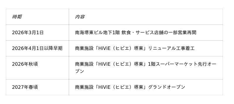 南海電気鉄道株式会社(社長:岡嶋 信行、以下「南海電鉄」)は、2026年4月1日以降早期に、高野線堺東駅直結の駅ビル「南海堺東ビル」のリニューアル工事に着手し、新たな商業施設「HiViE(ヒビエ)堺東」を2027年春にグランドオープンします。本施設は、高島屋堺店の跡地に開業するものです。