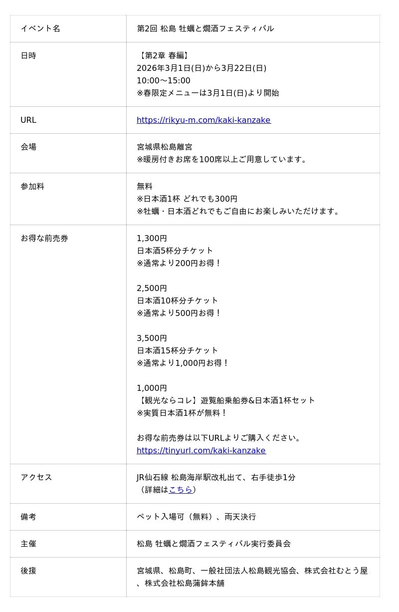 松島 牡蠣と燗酒フェスティバル実行委員会は、日本三景 松島(会場:宮城県松島離宮)で「松島 牡蠣と燗酒フェスティバル"第2章 春編"」を2026年3月1日(日)より開始いたします。