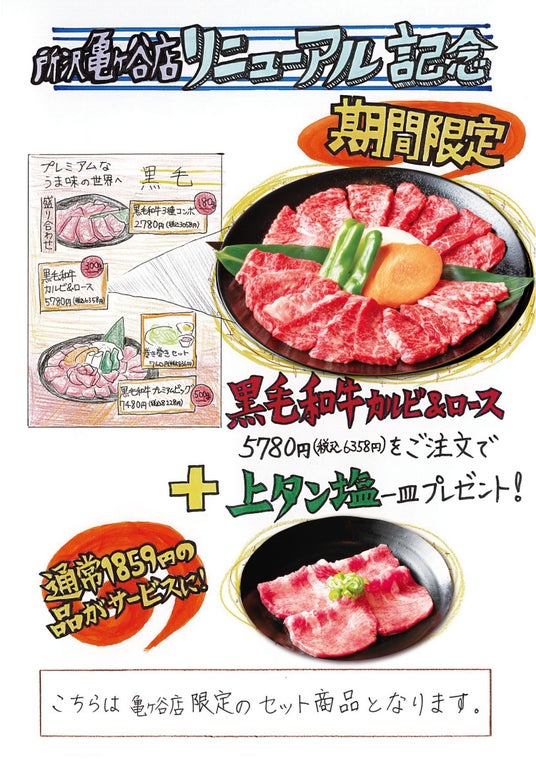 所沢亀ヶ谷店リニューアル記念。 3月31日(火)までの期間限定で、大皿の「黒毛和牛カルビ&ロース【300g】」5780円(税込6358円)をご注文のお客様に「上タン塩」1690円(税込1859円)を一皿プレゼントいたします!歓送迎会などの大切な集まりにピッタリな豪華な大皿の黒毛和牛の盛り合わせ。とろける黒毛和牛を炙れば、豊かな香りで笑顔になること間違いなしです!