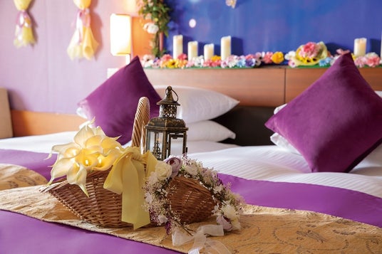 「グローイングフラワールーム」は、ホテル上層階に位置する特別フロア「ハースフロア」の客室に装飾を施したコンセプトルームです。扉を開けると、そこはまるでおとぎ話のワンシーンのような空間。ベッド周りの華やかなデコレーションに心が躍り、キャンドルやライトの光に癒されます。美しく幻想的な光を放つ花束や花冠などのアイテムが楽しいひとときに彩りを添えます。物語の主人公になったような気分で、特別な時間をお楽しみください。