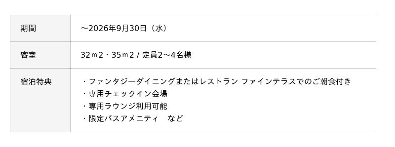 こちらのプランでは、ソファに座ってゆったりとチェックインの手続きができる「専用チェックイン会場」や到着日の12時からご出発日の16時までご利用可能な「専用ラウンジ」、限定バスアメニティ付きなど、優雅で快適なホテルステイをお約束する特典をご用意しております。朝食は「ファンタジーダイニング」または「レストラン ファインテラス」の2会場からお選びいただけます。「ファンタジーダイニング」での朝食は、専用宿泊プランをご予約のお客様のみが対象のため、ゆったりとした贅沢な時間をお過ごしいただけます。