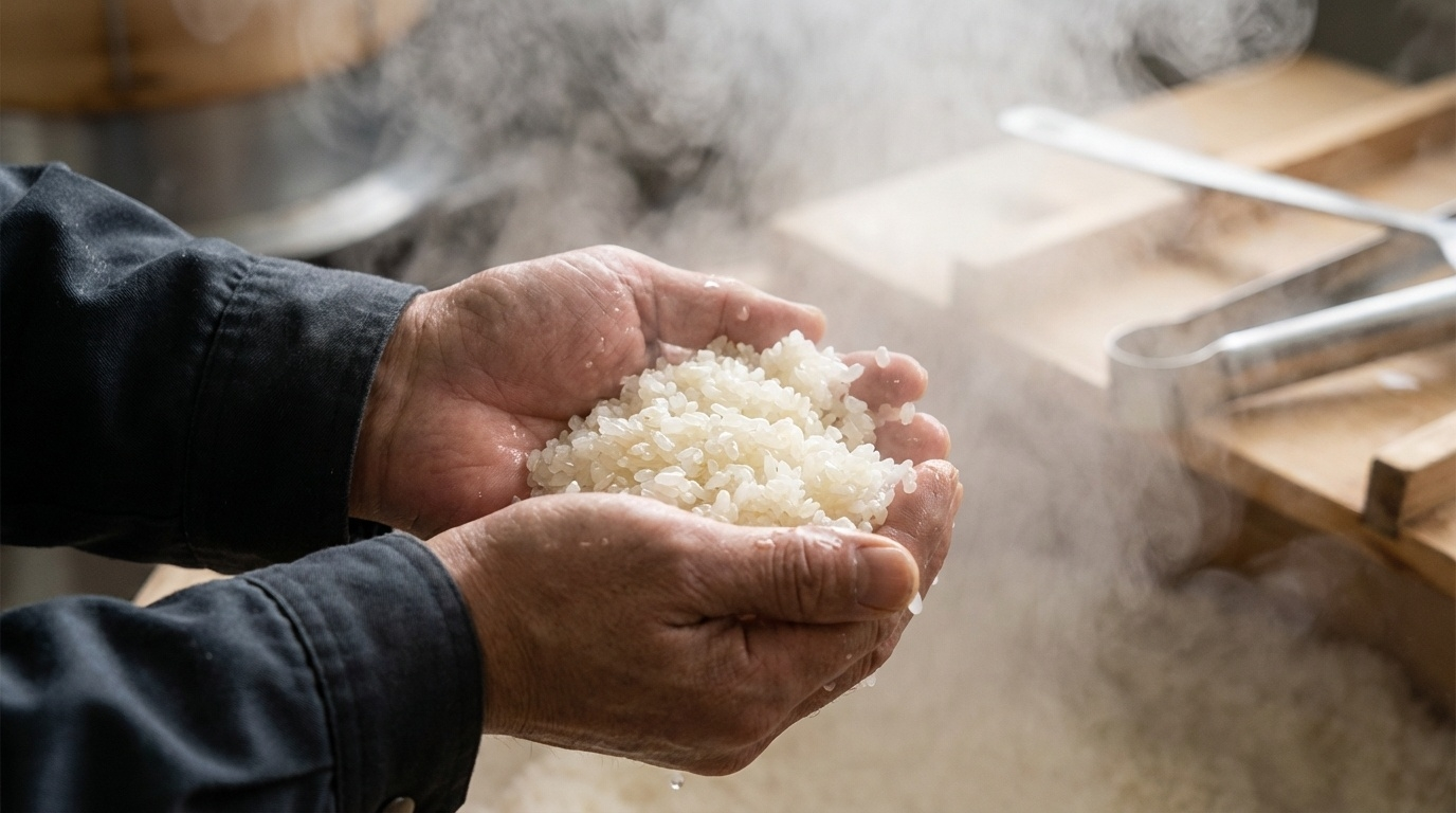 日本酒の技法「蒸米」の工程。山田錦を蒸している様子。米粒の形を残したまま糖化させる繊細な職人技により、お米本来の風味を最大限に引き出している。