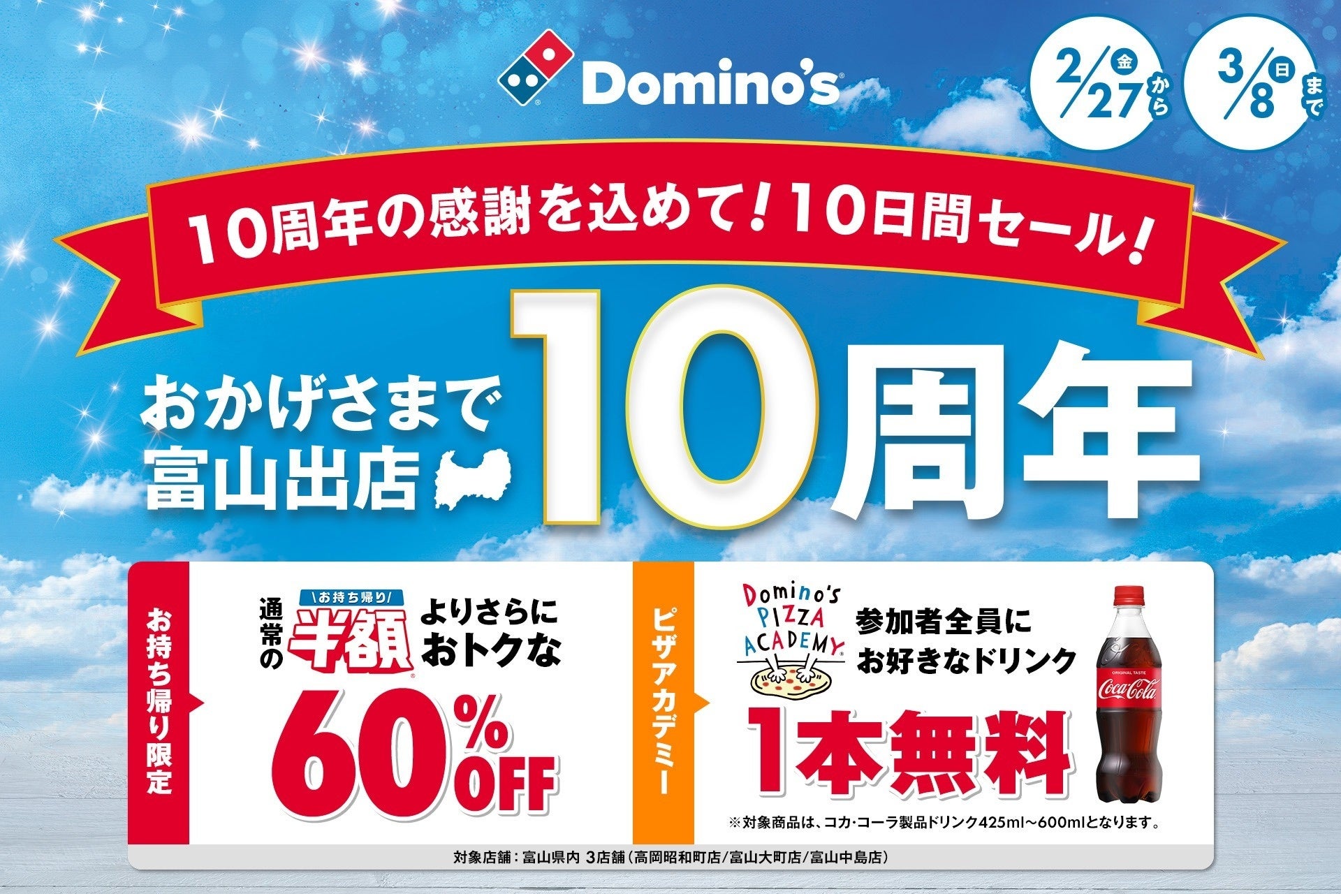 ドミノ・ピザ、富山県の皆さまに10年間のご愛顧を感謝「富山出店10周年記念」2月27日(金)~3月8日(日)10日間限定開催!~【お持ち帰り限定】ピザ全品60%オフ、ピザアカデミー参加でドリンク無料~