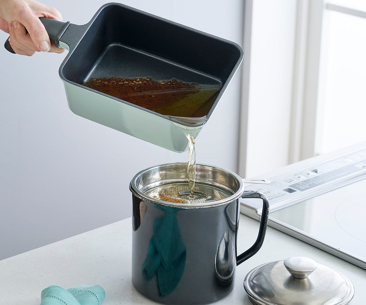 幅が広めのスクエア形状により、コンパクトながら少ない油でもしっかり揚げられるので、揚げ物料理がより気軽に楽しめます。また、スクエア形状は、エビフライなどの長い食材も揚げやすく、トンカツもゆったり揚げられます。使用後の油も鍋の角から注ぎやすく、後片付けにも便利です。また、付属品を本体にセットすれば、場所もとらずスマートに収納できます。