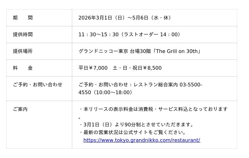 【グランドニッコー東京 台場】 The Grill on 30th「春のプリフィックスランチ」提供期間:2026年3月1日(日)~5月6日(水・休)