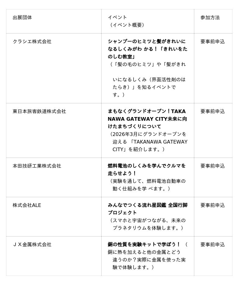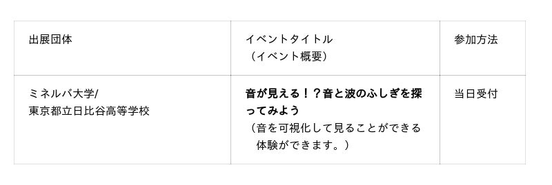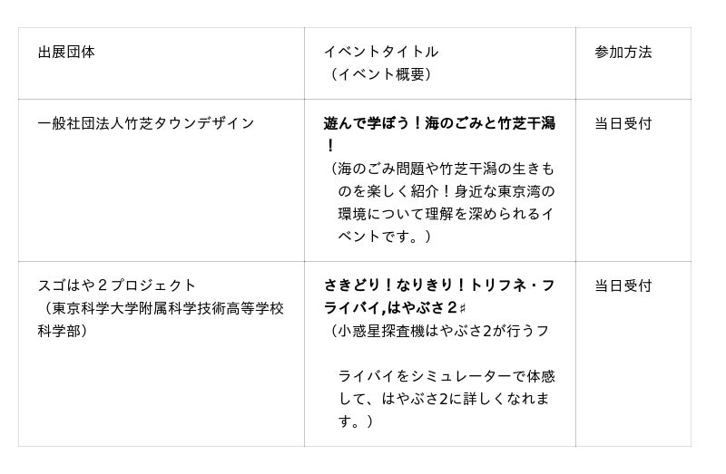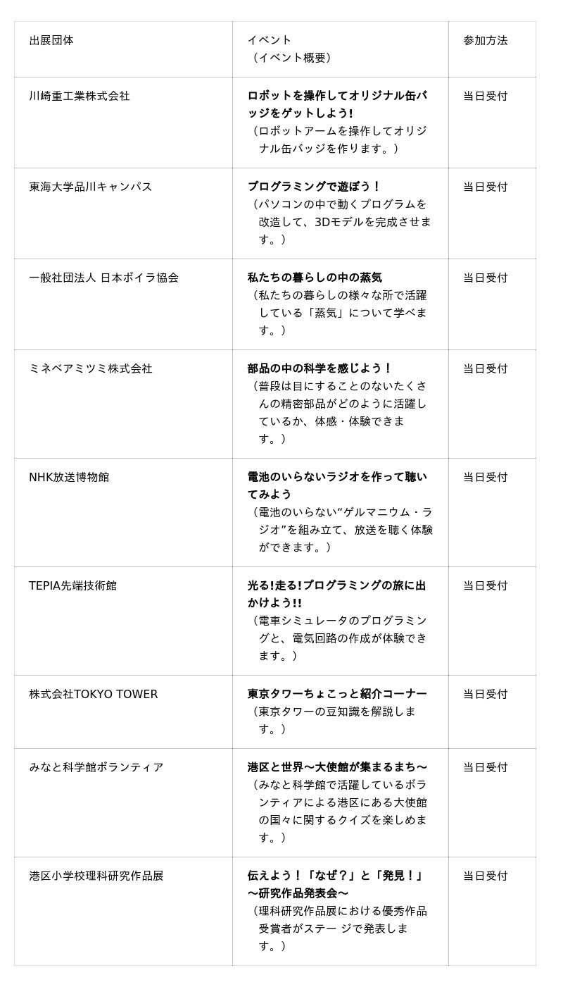 今年の「みなとサイエンスフェスタ」には、合計22の企業、団体、研究機関が出展いたします。